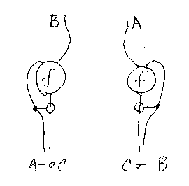 Aのワイヤー(向きが逆になります)とCのワイヤーを束ねている小物が留め金です。この図式法のミソは、(A --o C) という記法と絵図が一致することです。