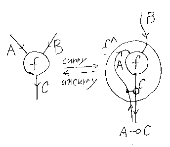 さらに面白いのは、C(A×B, C) = C(A, (C o-- B)) という記法を導入して、左右が逆になった留め金が導入できることです。左右対称な記号「--o」と「o--」が、絵図のそれと一致します。
