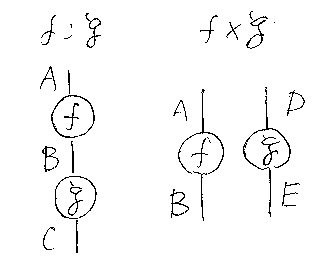 バエズ&ステイの図式法は、基本的には箱と線(boxes and wires)を使うものです(「デカルト閉圏におけるお絵描き計算の基礎」も参照)。ただし、箱が四角ではなくて丸印になっています。f:A→B, g:B→C, h:D→E として、f;g と f×h は次のような感じです。
