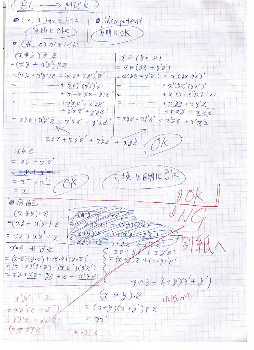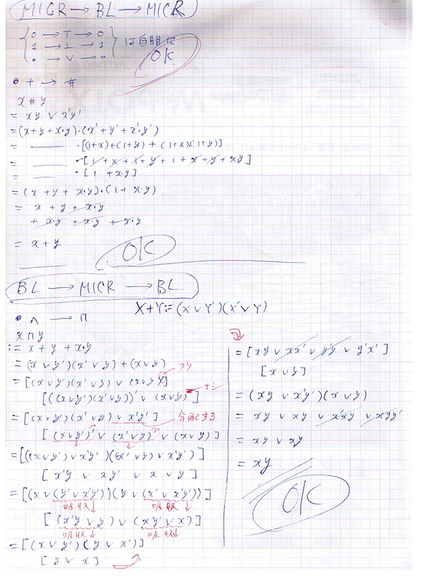 - 計算用紙 1:MICR→BLの確認、うまくいった。[追記]BL側の∧ベキ等律を忘れているけど、x∧x := x + x + xx = x + x + x = x 。[/追記]