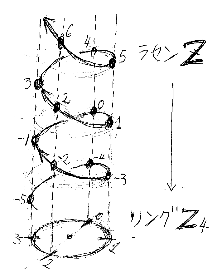 これが、「整数と、1を足す演算」からなる代数系から、「{0, 1, 2, 3}と、1を足す演算(ただし循環する)」からなる代数系への射(準同型写像)の図解です。たしか『らせん』と『リング』って恐い小説/映画がありましたよね。ここでは、整数(記号Z)がラセン、時計盤(記号Z4)がリングです。ちっとも恐くないです*2。