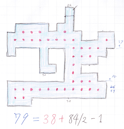 下の図は、僕が方眼紙に描いてみた少し複雑な例です。確かに、「面積 = 内部点の個数 + 周囲の長さ/2 - 1」となっていますよ。