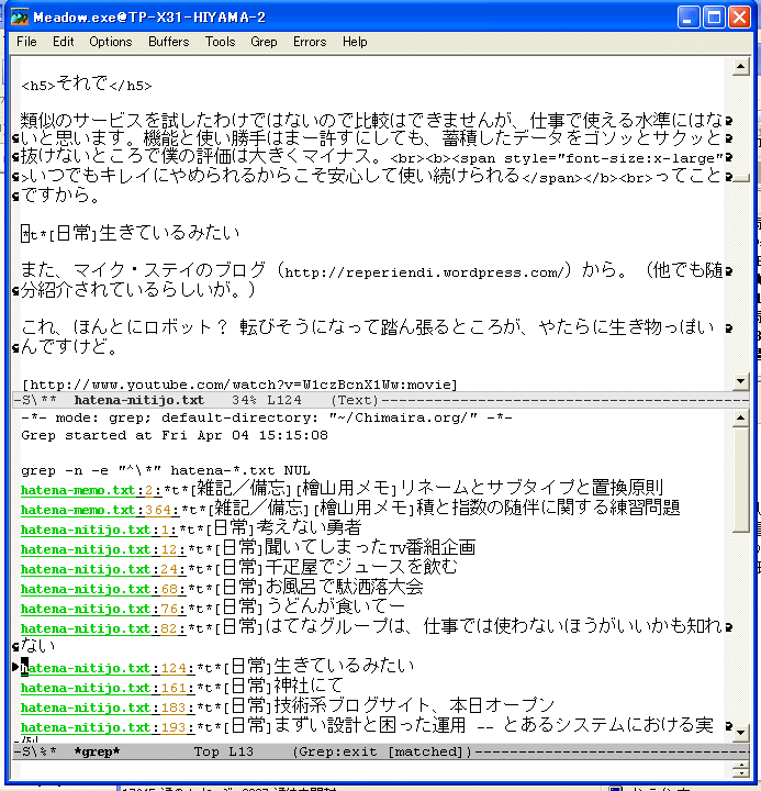 hatena-entries.grepをEmacsに読み込みます。そして、M-x grep-modeとすれば、上記と同じ状態になります。