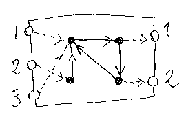 でも、いざとなったらホッピングボール・マシンの箱を開けて中を覗いてもかまいません。ホッピングボール・マシンの動作は非決定的でも、中の仕掛けは決まっています。ノードと呼ばれる場所と、ノードとノードを結ぶ辺と呼ばれる矢印から構成されています。これを図示すると有向グラフとしてよく知られた図形になります。下の図は、ホッピングボール・マシンの構造を図示した例です。黒丸が内部のノード、実線の矢印は辺、白丸は穴で、点線により穴とノードの結びつきを示しています。