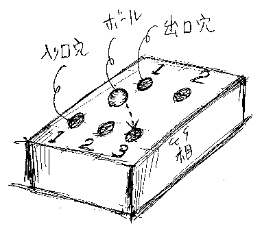 手前にいくつかの(例では3つの)穴が空いてます。ここからボールを入れます。入れたボールは何秒後かに向こうにある穴(例では2つ)のどれかから出てきます。入り口となる穴にも出口となる穴にも、それぞれ「1, 2, ...」と番号が振ってあります。また、ボールを入れてから出てくるまでの時間はキッチリ秒単位で計れるものとします。したがって、次のような言明は(正しいか間違っているかはともかくも)意味を持ちます。