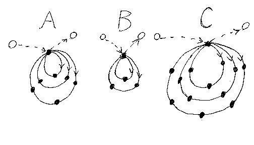 いくつかの素サイクルを、基点でくっつけた形のグラフを考えます。そのようなグラフを内部に持つホッピングボール・マシンを扱いましょう。入り口穴から入ったボールは基点に落ち、基点から出口穴に飛び出すとします。以下のA、B,Cはこのタイプのホッピングボール・マシンの例です。