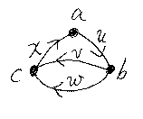 下の図のようなグラフでは、a→b→c→a と書いただけではサイクルを特定できません。bからcに至る辺が2本あるからです。このときは、a-(u)→b-(v)→c-(x)→a とか、a-(u)→b-(w)→c-(x)→a のように書くべきでしょう。しかし、2つのノードを結ぶ同方向の辺がたかだか1本であれば、a→b→c→a のような書き方で十分です。しばらくは、多重辺(2つのノードを結ぶ同方向の辺が複数)を考えないので、a→b→c→a のような書き方を使います。