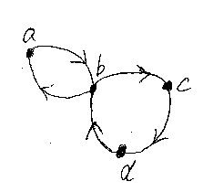 例えば上の図で、a→b→a→b→c→d→b→a はサイクルです。このサイクルは、同じノード(例えばb)を何度も通過してます。各ノードを1回しか通過しないサイクルは素サイクルと呼びましょう。a→b→a、b→c→d→b は素サイクルです。サイクルでは、運動の出発点=到着点ですが、この点(ノード)を基点ノード、あるいは単に基点と呼びます。ただし、基点を問題にしないときもあって、そのときは、a→b→a と b→a→b は同じサイクルとみなします。