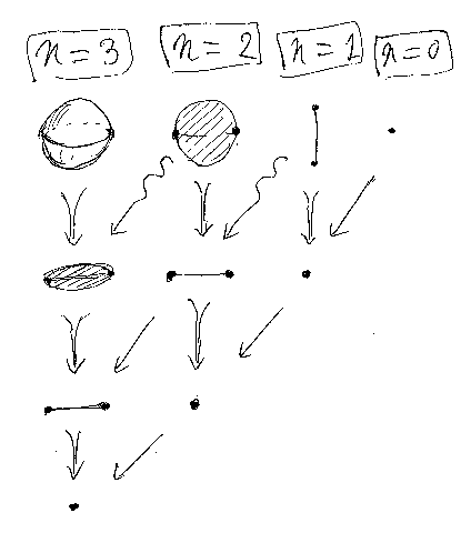 n = 3 のところを見ましょう。普通の3-セルは3次元の球体です。上端=上の半球面α と 下端=下の半球面β は異なるのが普通ですが、もちろん同一でもかまいません。上端=下端=αである球体をつぶしてしまえば、円板αと区別できなくなります。図の n = 2 の一番上は円板ですが、円板をつぶれた球体とみなすこともできます。その「みなし」が左斜め下に向かう矢印です。αが円板=2-セルのとき、id(α)は id(α):::α≡>α というつぶれた球体=3-セル となるわけです。