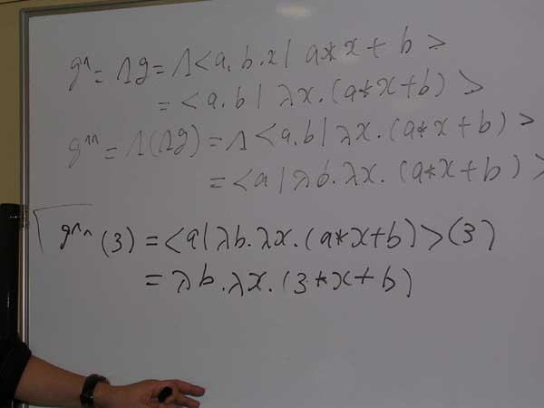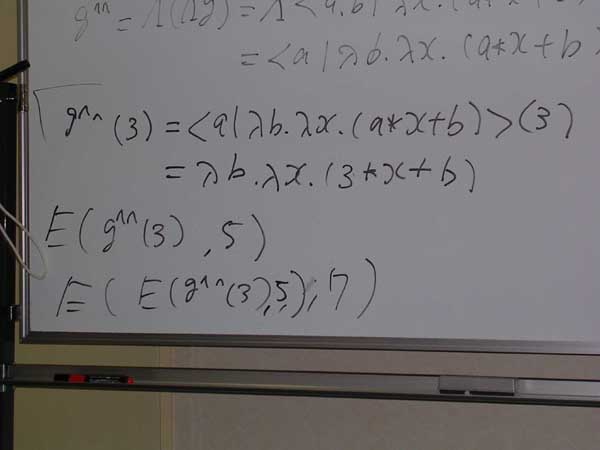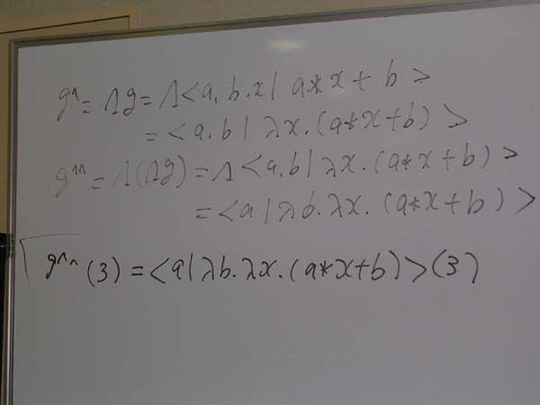 gの1回ラムダ抽象 g^ = Λg と、gの2回ラムダ抽象 g^^ = Λ(Λg) を計算してみます。Λの計算規則*3を使えば、こうなって、こうして、こうですね(ホワイトボード 1行から4行)。