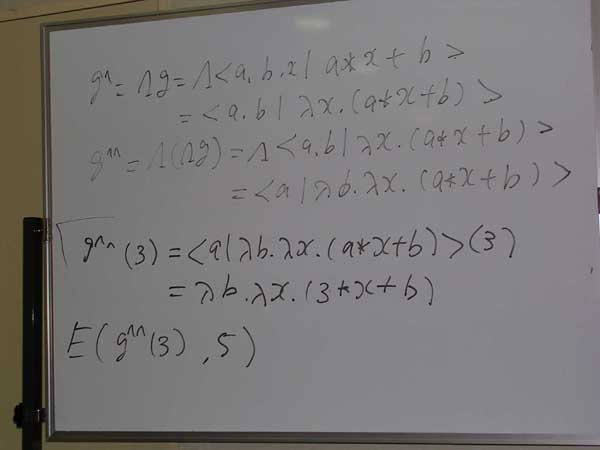 基本等式を使うと、 E(g^^(3), 5) = g^(3, 5) = <a, b| λx.(a*x + b)>(3, 5) である点にも注意。
