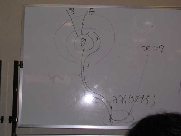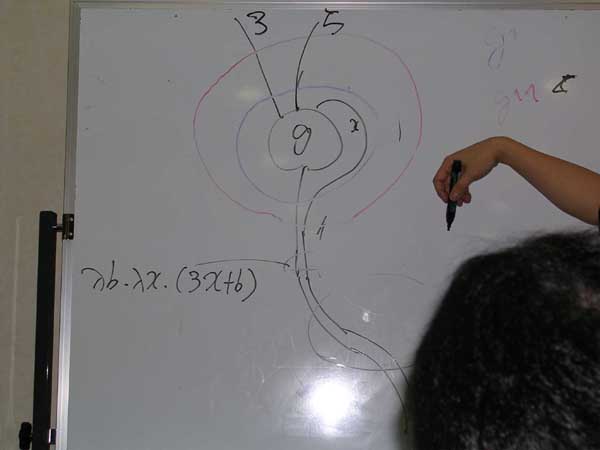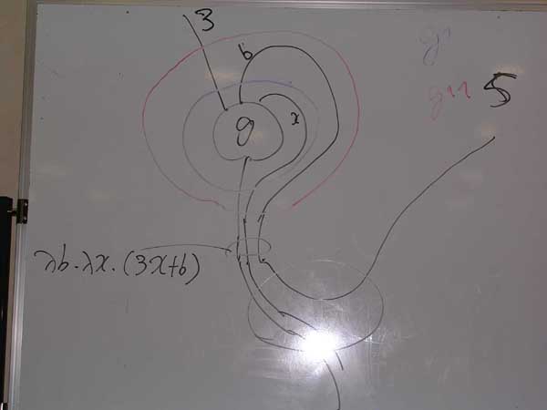 λb.λx.(3*x + b) のbを5に具体化しましょう。(λb.λx.(3*x + b))(5) ってしたくなるでしょうが、それは出来ませんよ。小さいラムダ式はこれ自体としては関数(働き、入力と出力を持つ箱)じゃありませんから。実行エンジンEの第1引数となるべきデータなんです。セミナー第1回を受けた方は、箱とカードの区別を思い出してね。