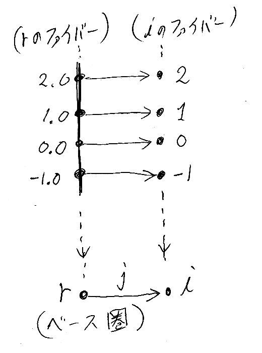 1本の連続直線(実数)とパラパラの点の集まり(整数)があり、連続直線上の格子点から、対応する整数点に向けて矢印が出ている形になります。先走りして(まだ説明してない)ファイブレーション射影も描くと、連続直線の影が'r'に、パラパラ点達の影が'i'に落ちて、ハシゴの横木のような矢印達の影が'j'に落ちます。