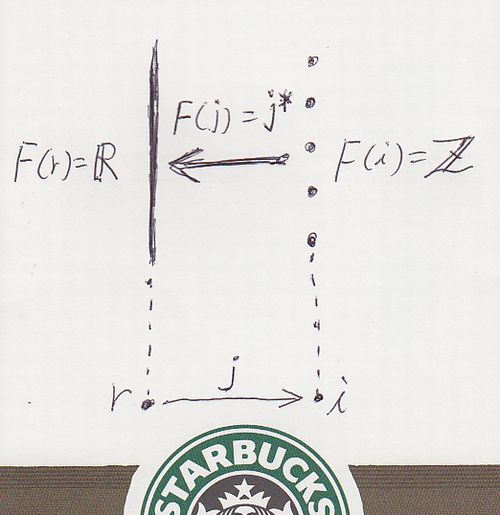 j* = F(j) は、Z→R という包含写像でした。j*(n) は、「実数とみなされた整数n」のことです。例えば、j*(1)は「実数とみなされた整数1」です。「実数とみなされた整数1」を 1.0 と表記することにします。j*(1) = 1.0、j*(2) = 2.0、j*(0) = 0.0、j*(-1) = -1.0 などと書きます。