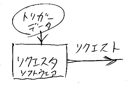 すぐ上の絵では、トリガーからリクエストの矢印が出ているように描いてますが、実際にはソフトウェアが介在します。実際のHTTPリクエストを発行するソフトウェア部品をリクエスターと呼ぶことにします。トリガーがリクエスターの入力となってはじめてリクエスト発行が可能となります。