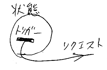外部から見たリクエスト処理の実行単位をアクションと呼ぶことにします。アクションはサーバー側に配置され、リクエストデータを入力としてレスポンスデータを出力します。アクションを引き起こすリクエストの発行基点をここではトリガーと呼びましょう。アクションから出力されたレスポンスデータは、クラアント側の状態となると仮定します。絵に描くと次のとおりです。