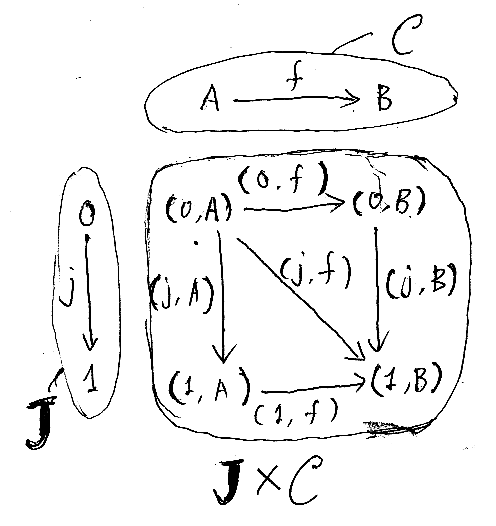 まず、実数区間[0, 1]に相当する圏を探します。J = {0→1} という圏が[0, 1]の代わりに使えます。詳しく書くと: