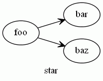 この図のように、ひとつのノード(foo)を中心として隣接するノード(bar, baz)とそこに至る辺の集まりをスターと呼びます。この場合、スターの中心はfooなので、fooを中心とするスターといいます。