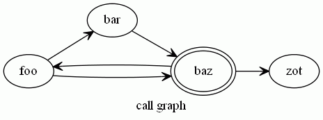 Graphvizでは今使っているGraphvizフロントエンドに問題があって、自己ループ辺を簡単には描けないので、baz→baz というループを描く代わりにノードbazを二重丸で描いて識別しています。