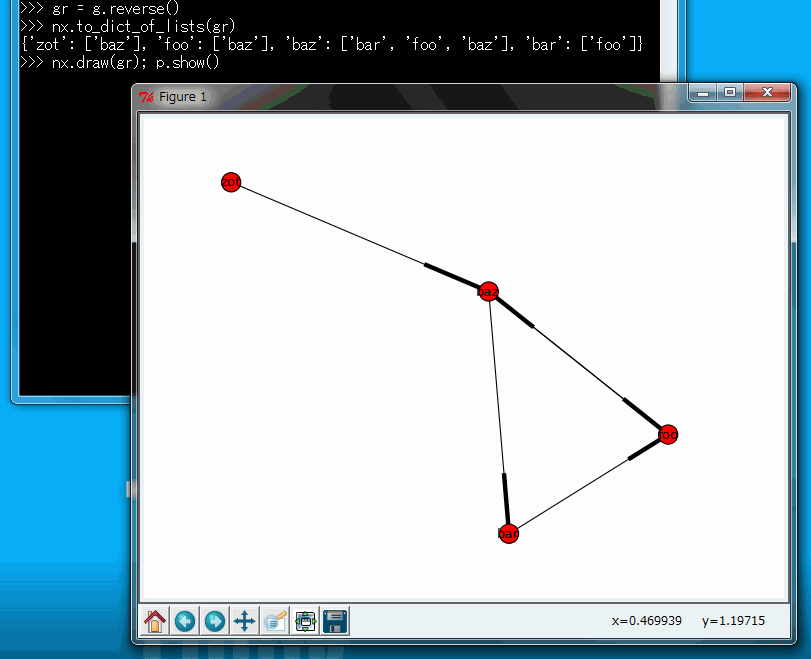 $ python Python 2.6.5 (r265:79096, Mar 19 2010, 21:48:26) [MSC v.1500 32 bit (Intel)] on win32 Type "help", "copyright", "credits" or "license" for more information. >>> import networkx as nx >>> import matplotlib.pylab as p >>>