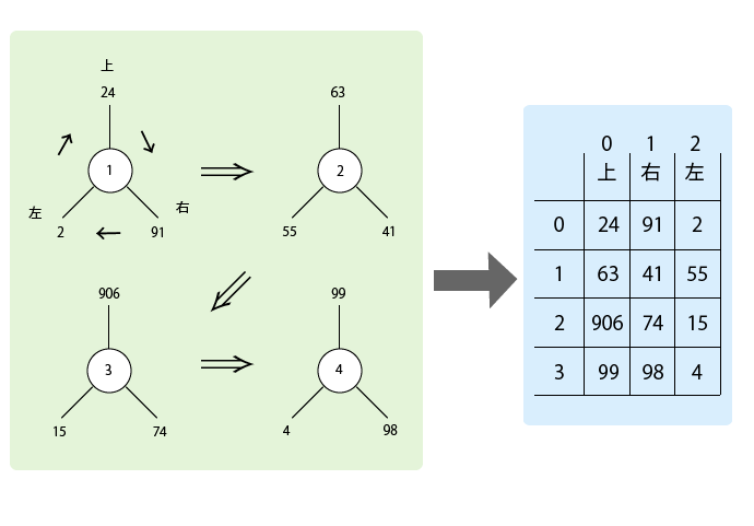 以下の左の絵では、「枝が出たマル」の図形が4つ描いてあります。この絵は、以前僕が話した内容をSS君が描いてくれたものです。マルには、左、右、上の枝が出ていて、それぞれの枝の先に整数値がラベルされています。この「3本の枝が出たマル × 4」が持つ整数値情報を2次元マトリックス(テーブル)にまとめようという話です。