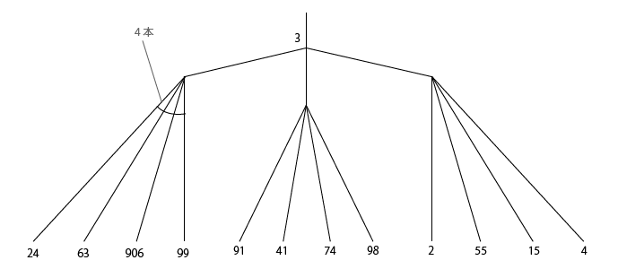 僕の自然な感覚では(人により自然さは違う)、4つのマルをそのまま兄弟ノード群にして、親としてルートノードを新たに付け加えてツリーを作ります。しかし、次のツリーは、あえて自然な構成とは違う配置にしています。マトリックスで見ると、縦と横のどちらを先に見るかの問題なので、まー「どっちもアリ」でしょう。