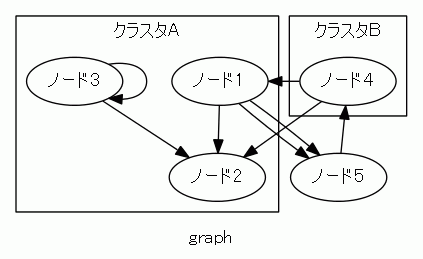 グラフGは、ノードの集合Nと(有向な)辺の集合Eからなりますが、Nの部分集合をクラスタと呼ぶことにします。クラスタはノードの集合です。以下のグラフでは、クラスタAとクラスタBは領域として描かれています。集合としては、N = {1, 2, 3, 4, 5}、A = {1, 2, 3}, B = {4} です。