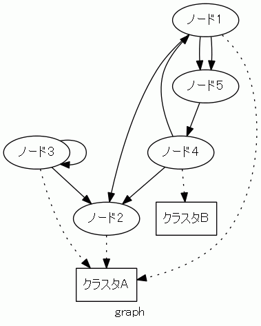 通常ノード(楕円)とクラスタノード(四角)のあいだの点線の辺は所属関係を表します。「ノード : クラスタ = ファイル : ディレクトリ」という類比で考えるといいでしょう。