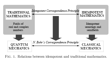 マソロフ脱量子化とその広大な応用分野を、要領よくまとめた報告である"MASLOV DEQUANTIZATION, IDEMPOTENT AND TROPICAL MATHEMATICS: A BRIEF INTRODUCTION"(http://glitvinov.googlepages.com/2007_JMS_426.pdf)に次の図が載っています。