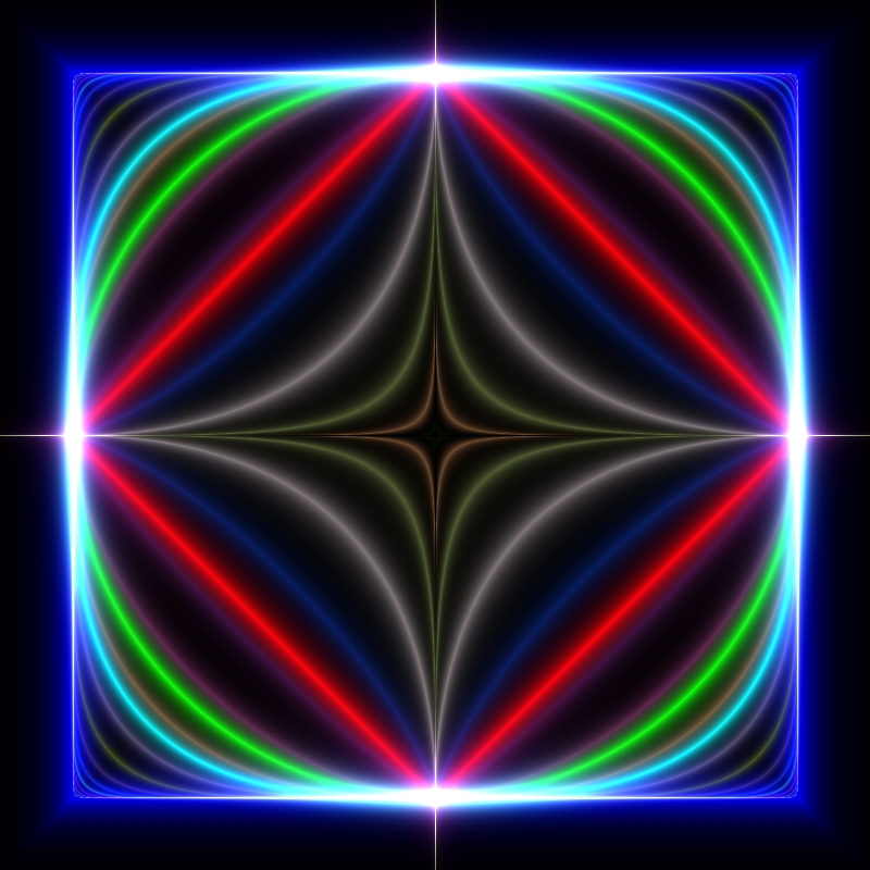 pが1未満になると、球体が非凸になってしまうので考えないことが多いのですが、0 < p < 1 の範囲まで2次元で描いた図がありました。p-ノルムの円が色付きで表示されています。
