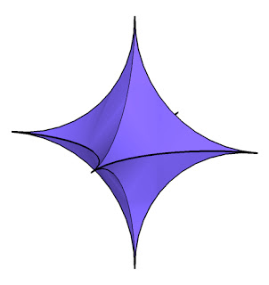 赤い菱型の内側に入るへこんだ図形は、0 < p < 1 に対するノルム円となります。3次元のへこんだノルム球は次のようにひっこんでとんがった形です。