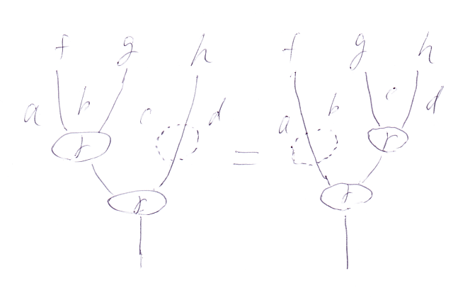 この形になってしまえば、最初に導入したf, g, hはもう出てこないので、集合と写像の解釈から離れて、モノイド圏Vのなかの等式として意味を持ちます。