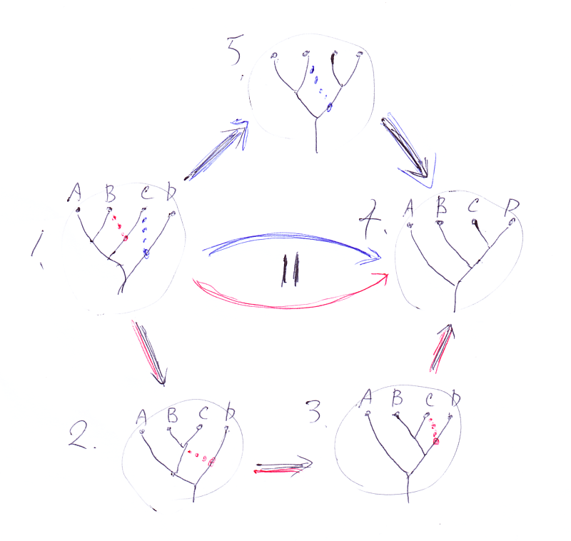 五角形の話と絵は「2月の圏論勉強会」(2009年)と「マックレーンの五角形の絵」(2011年)に書いてあります。以下にまた新しく描いた五角形の絵。