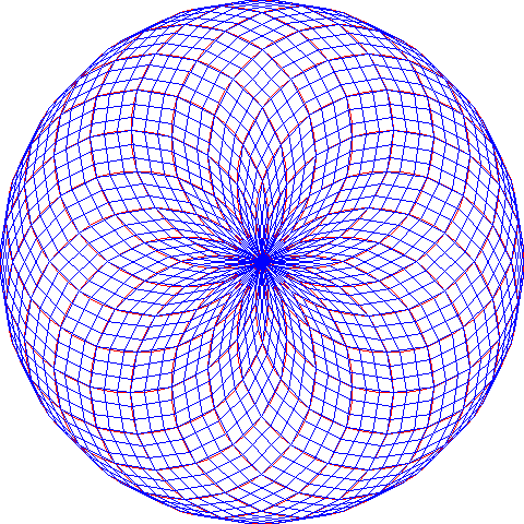 θ1-θ2空間のメッシュに写像cを適用すると、写像先のx-y空間の円内に次のような模様が描かれます。