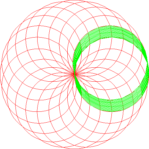 for (i in 1:(N + 1)) grid.lines(xValMatrix[i,]*0.5 + 0.5, yValMatrix[i,]*0.5 + 0.5, gp = gpar(col="red")) w <- (2*pi)/N # 帯の幅 th1Breaks2 <- seq(0, 2*pi, (2*pi)/N) # 縦方向の線群 荒い th2Breaks2 <- seq(0, pi + w, w/N) # 横方向の線群 一部だけ、とても細かい xValMatrix2 <- outer(th1Breaks2, th2Breaks2, cX) yValMatrix2 <- outer(th1Breaks2, th2Breaks2, cY) for (j in 1:(N + 1)) grid.lines(xValMatrix2[,j]*0.5 + 0.5, yValMatrix2[,j]*0.5 + 0.5, gp = gpar(col="green"))