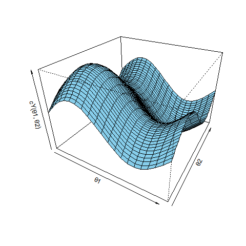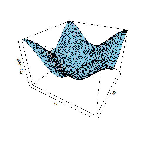 persp(th1Breaks, th2Breaks, xValMatrix, xlab = "θ1", ylab = "θ2", zlab = "cX(θ1, θ2)", xlim = c(0, 2*pi), ylim = c(0, 2*pi), zlim = c(-1, 1), theta = 30, phi = 30, expand = 0.7, col = "skyblue") persp(th1Breaks, th2Breaks, yValMatrix, xlab = "θ1", ylab = "θ2", zlab = "cY(θ1, θ2)", xlim = c(0, 2*pi), ylim = c(0, 2*pi), zlim = c(-1, 1), theta = 30, phi = 30, expand = 0.7, col = "skyblue")