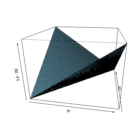 d <- function(theta1, theta2) { abs(theta2 - theta1) } N <- 100 # 0から2πまでをN等分したメッシュを作る x <- seq(0, 2*pi, by=(2*pi / N)) y <- x # プロット用にz値の行列を作成する z <- outer(x, y, d) # 3Dプロット persp(x, y, z, xlab = "θ1", ylab = "θ2", zlab = "|θ2 - θ1|", xlim = c(0, 2*pi), ylim = c(0, 2*pi), zlim = c(0, 2*pi), theta = 10, phi = 20, expand = 0.7, col = "skyblue")