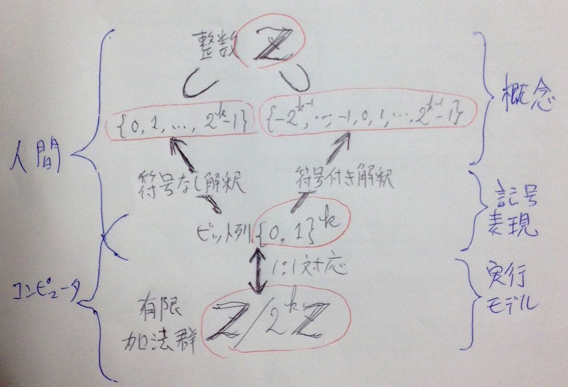 {0, 1}kと通常の整数Zとの対応をどう取るかは、プログラミング言語のモデルとか人間の解釈の問題です。{0, 1, 2, ..., 2k-1} ⊆ Z と {0, 1}k の対応を考えるのが符号なし整数解釈(本文では正整数解釈)、{-2k-1, ..., -1, 0, 1, ..., 2-1k-1} ⊆ Z との対応を考えるのが符号付き整数解釈(本文では正負整数解釈)となります。