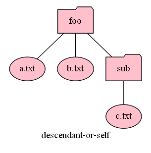 このテの話がややこしくなるのは、同じ指定やスラッシュの違いだけで、その解釈が descendant-or-self, descendant, self, child::file() のように変わるからです。そしてさらに鬱陶しいのは、ノード状態やノードセットを正確に記述できる記述言語がないことです。