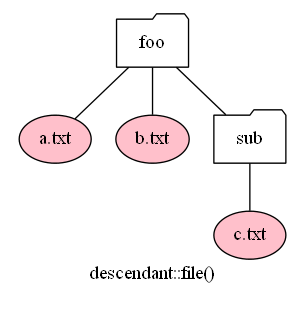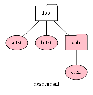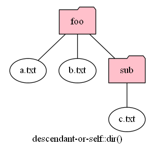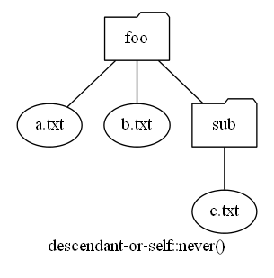以下は、child::file()、descendant::file()、descendant-or-self::dir()、descendant-or-self::never() を図示したものです。