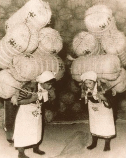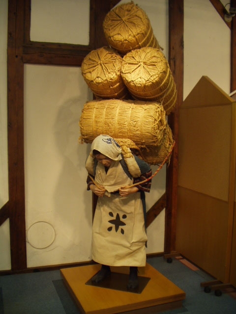 60kgの米俵5俵で総計300kgを女性がかついでいる! にわかには信じがたいです。この写真は合成? そうも見えないし、山形県酒田市の庄内米資料館(山居倉庫)という所に次のような人形が展示してあるらしいです。