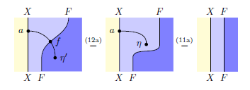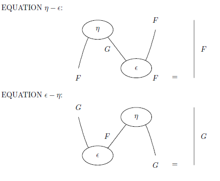 キュリアのはオダンゴが大きすぎて邪魔くさいですね。マースデンのほうがずっと見やすい。ただ、マースデンは、ワイヤーのラベル(関手の名前)を枠の外にだけ書くようにしているらしく、無名のワイヤーの意味が取りにくいことがあります。一番左の絵で言えば、ηとεを繋ぐワイヤーはGなのですが、それが明示されていません。