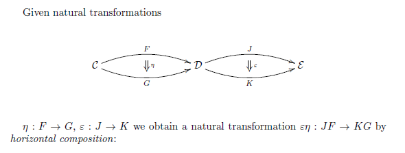 - 横結合: η : F → G : C → D と ε : J → K : D → E に対して、その横結合は ηε : JF → KG