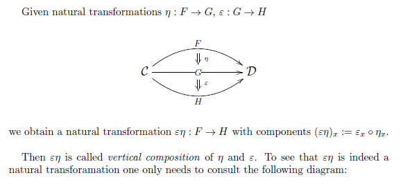- 縦結合: η : F → G と ε : G → H に対して、その縦結合は εη : F → H