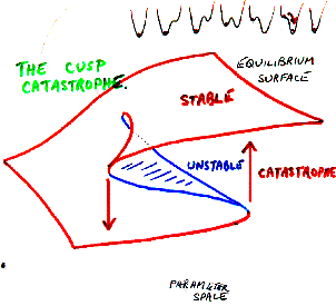 この絵は、ルネ・トムのカタストロフ理論を象徴する図形のひとつです。高次圏の法則に対する律子は、典型的な特異点パターンに対応するようなので、ニョロニョロ律子がカスプ特異点を持ち上げた形状なのはその一例なんでしょう、よく知らんけど。