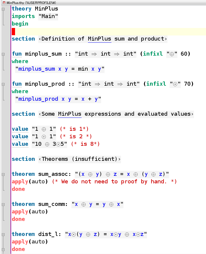 min-plus半環が実際に半環の公理の満たすことを一部だけ示しています。この程度の定理なら自動証明でいけます。