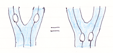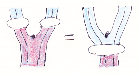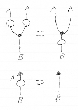 (1)は、モノイド乗法 m:AA→A を描いたものです。ワイヤーがA、黒丸が乗法mです。(2)は、それに厚みを付けたもの。乗法は白丸になっています。(3)は、厚み付きワイヤーを心線(芯線)と青い関手シースとして描いたものです。これが、ラックス・モノイド関手 (F, μ, ε) の乗法 μA,B:F(A)