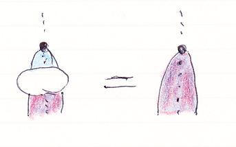 これをヒントに、モノイド自然変換 ψ::(F, μ, ε)⇒(G, ν, ι) の絵を描きましょう。ここで、(F, μ, ε) と (G, ν, ι) はラックス・モノイド関手です。絵で、青い関手シースがFを表し、紫(青に赤を上塗り)の関手シースがGを表します。白いオダンゴがψです。