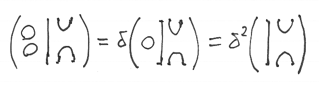 - kが可換体*1で、δ∈k として、δをサークル乗数とするテンパリー/リーブ圏(Temperley-Lieb category)をTL(k, δ)と書きます。可換体(スカラー体)kが了解済みならTLδと略記します。さらにδも了解済みなら単にTLと書きます。