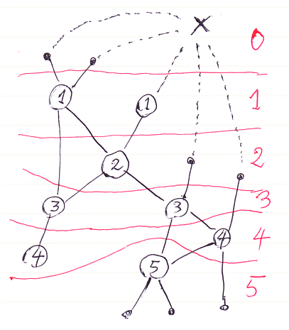 バッテンは仮想ルートノードです。ノード内にレベルの値が書き込んであります。同じレベルのノードを1つの“層”として、赤線で層分けしています。レベル0の層は仮想ルートノードだけです。